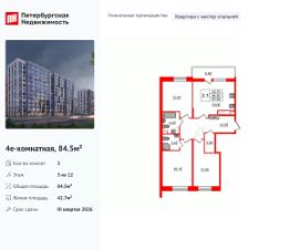 Уникальная, функциональная европланировка, большая кухня-гостиная 18 м², просторная прихожая 13.55 м². Общая площадь квартиры - 84.5 м², жилая 42.7 м², высота потолка 2.77 м.
