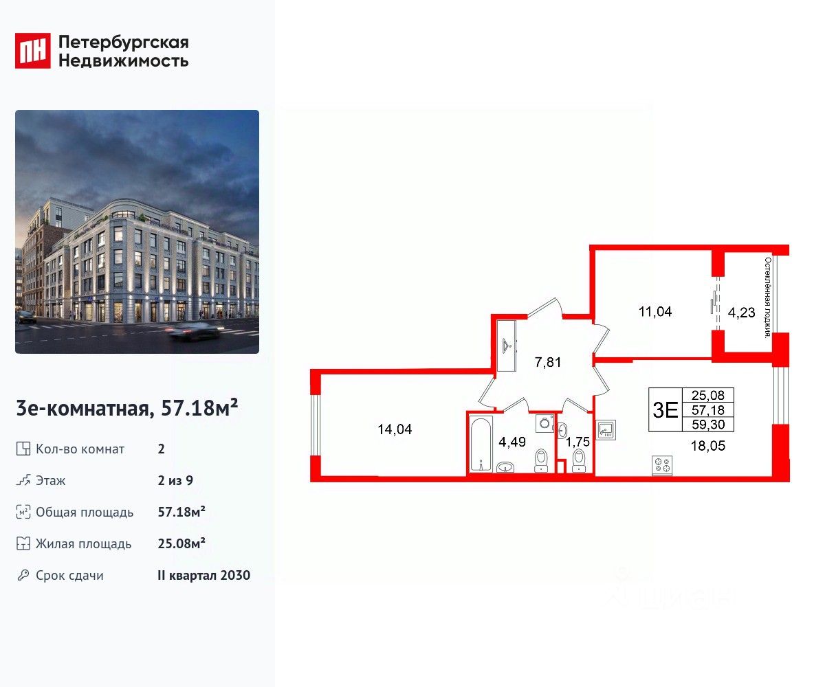 Удобная, классическая, функциональная европланировка, большая кухня-гостиная 18.05 м², просторная прихожая 7.81 м². Общая площадь квартиры - 57.18 м², жилая 25.08 м², высота потолка 3 м.