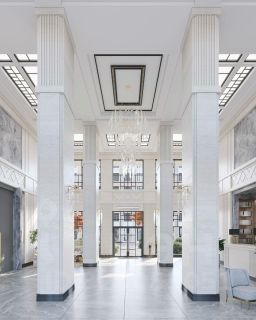 • Парадное лобби с потолком до 6,5 м и лаунж-зоной с камином.