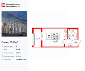 Удобная, классическая, функциональная европланировка, просторная прихожая 3.8 м². Общая площадь студии - 23.65 м², жилая 16.77 м², высота потолка 3 м.