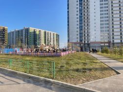 Два здания "Правого берега-3" образуют уютное дворовое пространство, в котором располагаются тротуары с плиточным покрытием, детский городок, физкультурная площадка, газоны и цветники, деревья, кустарники.