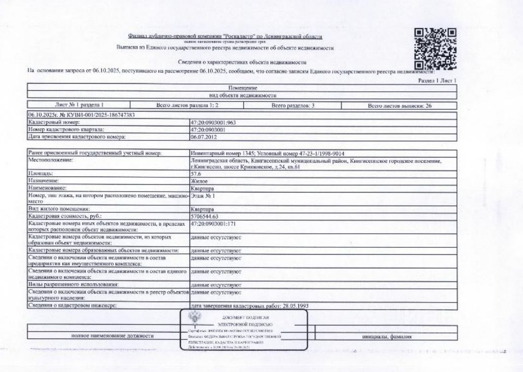 Лот2(повторные) Подвергнутое аресту Кингисеппского РОСП по и/п 47143/25/47024-ИП и принадлежащее должнику Кивистик А.В. арестованное имущество: 1/16 долей в квартире общ.пл. 57,6 кв.м. кадастровый 47:20:0903001:963, расположенная по адресу: ЛО, Кингисеппский район, г. Кингисепп, Крикковское шоссе, д. 24, кв. 61.Форма 7, Форма 9 от 17.09.2025, в квартире зарегистрировано 4 человека, в том числе 3 несовершеннолетних. Сведения о задолженности по взносам на капитальный ремонт судебным приставом-исполнителем не представлены
