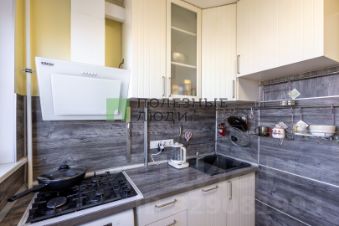 Кухня компактная, но полностью мебелирована. Здесь есть вся необходимая мебель, а также встроенная стиральная машина — можно сразу начинать комфортную жизнь.