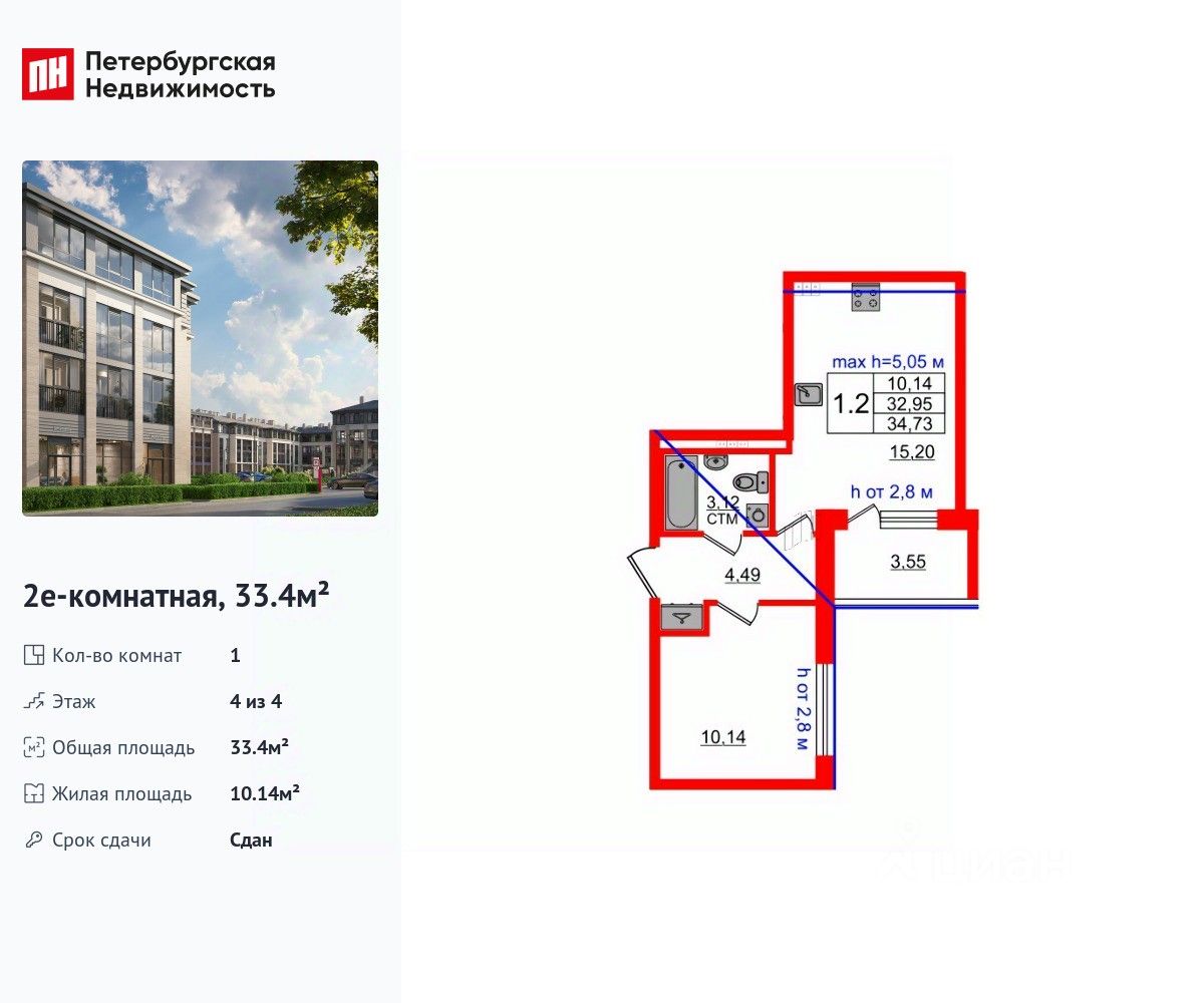 Удобная, классическая, функциональная европланировка, большая кухня-гостиная 15.2 м², просторная прихожая 4.49 м². Общая площадь квартиры - 33.4 м², жилая 10.14 м².
