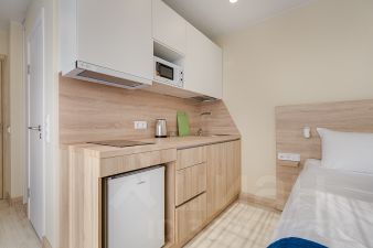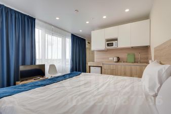 В квартире есть все для комфортного проживания. Двуспальная кровать с ортопедическими матрасами и ящиками для хранения; дополнительно поставили обеденный стол и вместительный шкаф для одежды; есть подушки, одеяло, постельное белье. Кухонный гарнитур из износостойких материалов со встроенной техникой: варочная панель с вытяжкой, холодильник, микроволновая печь; дополнительно есть обеденный стол со стульями, посуда для приготовления, электрический чайник, тарелки и стаканы, столовые приборы