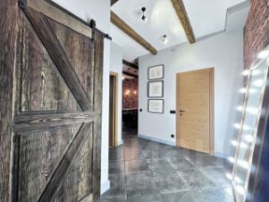 Интерьер квартиры сочетает в себе элементы лофта и хай-тека, что идеально подходит для тех, кто ценит практичность и функциональность. Грубая индустриальная отделка гармонирует с современными элементами и техникой. В отделке использованы металл, стекло и натуральное дерево. Четкие линии и простые геометрические формы создают минималистичный и стильный облик, а обилие света (как естественного, так и искусственного) наполняет пространство жизнью.
