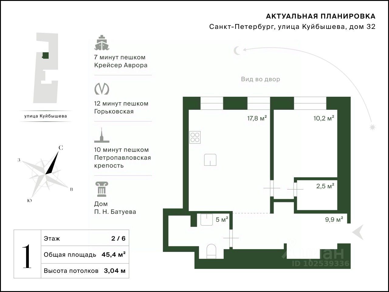 Жилое пространство разделено на зону кухни-гостиной, полностью оборудованную всей необходимой техникой и мебелью для комфортного размещения Ваших гостей и приватную зону спальни с гардеробной для отдыха в уютной атмосфере. Квартира имеет ряд преимуществ, наделяющих ее уникальной Петербургской атмосферой. Общая площадь квартиры 45,4 кв. м. Окна квартиры выходят в тихий двор.