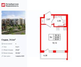 Удобная, классическая, функциональная европланировка, вместительная прихожая 2.87 м². Общая площадь студии - 24.6 м², жилая 18.14 м², высота потолка 2.77 м.