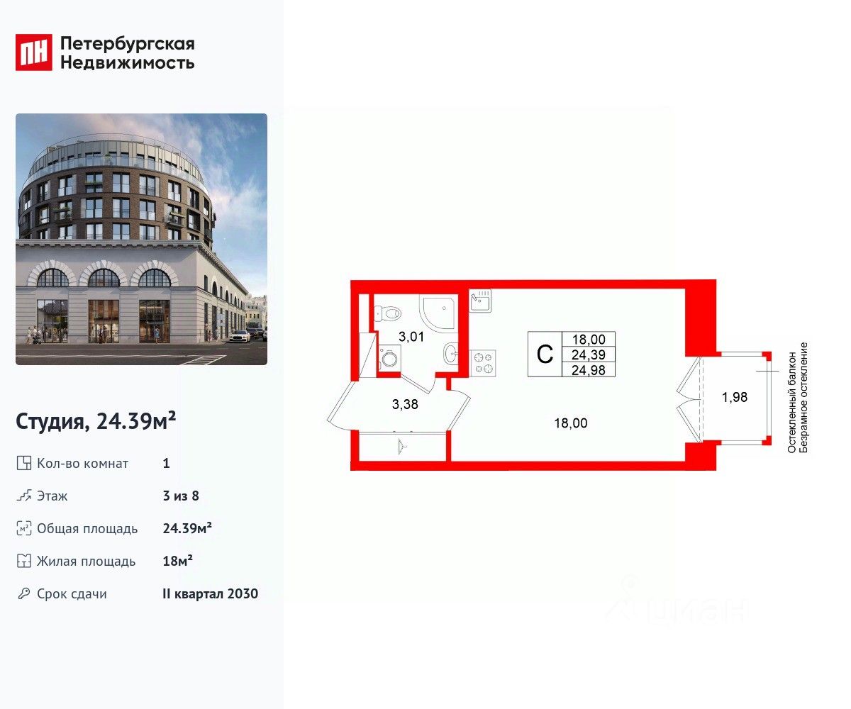 Удобная, классическая, функциональная европланировка, просторная прихожая 3.38 м². Общая площадь студии - 24.39 м², жилая 18 м², высота потолка 2.72 м.