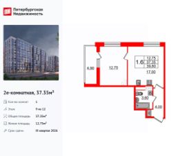 Удобная, классическая, функциональная европланировка, большая кухня-гостиная 17 м², вместительная прихожая 4 м². Общая площадь квартиры - 37.35 м², жилая 12.75 м², высота потолка 2.77 м.