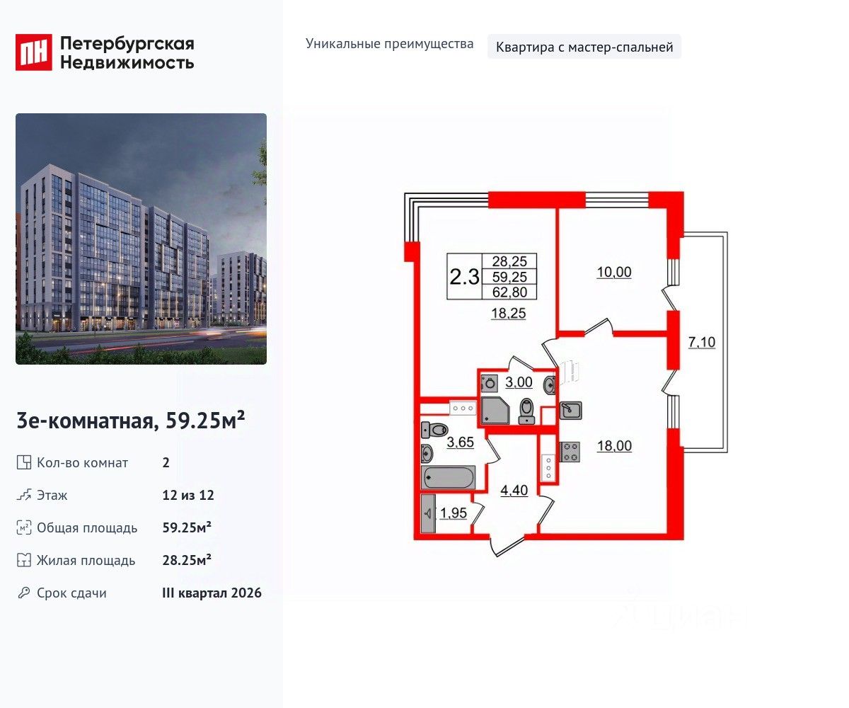 Уникальная, функциональная европланировка, большая кухня-гостиная 18 м², вместительная прихожая 4.4 м². Общая площадь квартиры - 59.25 м², жилая 28.25 м², высота потолка 3 м.