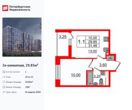 Удобная, классическая, функциональная европланировка, большая кухня-гостиная 13 м², вместительная прихожая 3.6 м². Общая площадь квартиры - 29.85 м², жилая 10 м², высота потолка 2.77 м.