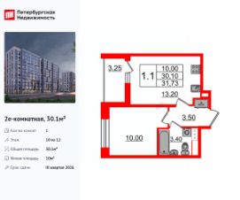 Удобная, классическая, функциональная европланировка, большая кухня-гостиная 13.2 м², вместительная прихожая 3.5 м². Общая площадь квартиры - 30.1 м², жилая 10 м², высота потолка 2.77 м.