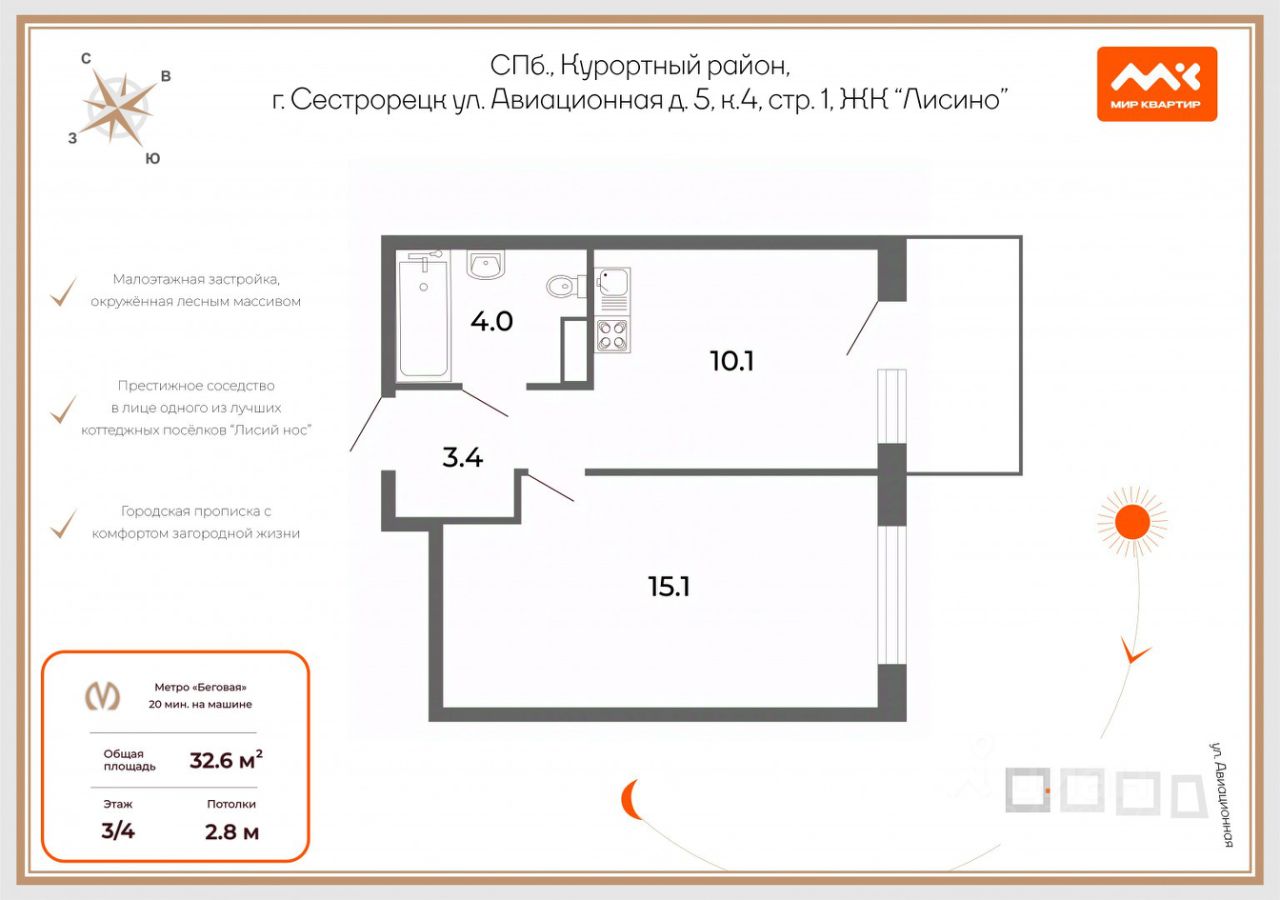 Арт. 132110230 Квартира с одной спальней и отдельной кухней в сданном корпусе отличного малоэтажного комплекса "Лисино".