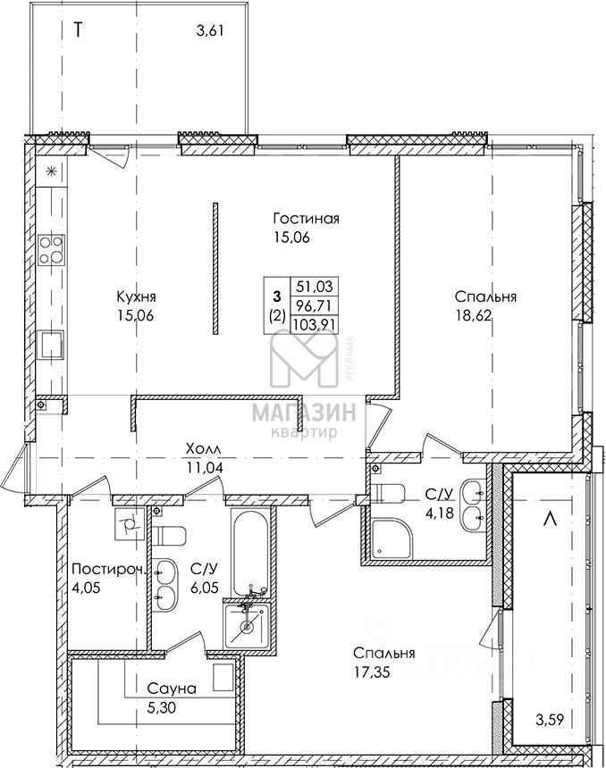 3-х комнатная свободной планировки, с большой террасой, балконом и сауной.