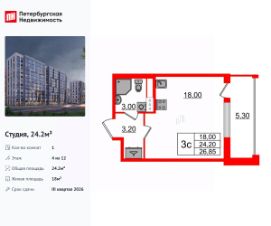 Удобная, классическая, функциональная европланировка, просторная прихожая 3.2 м². Общая площадь студии - 24.2 м², жилая 18 м², высота потолка 2.77 м.