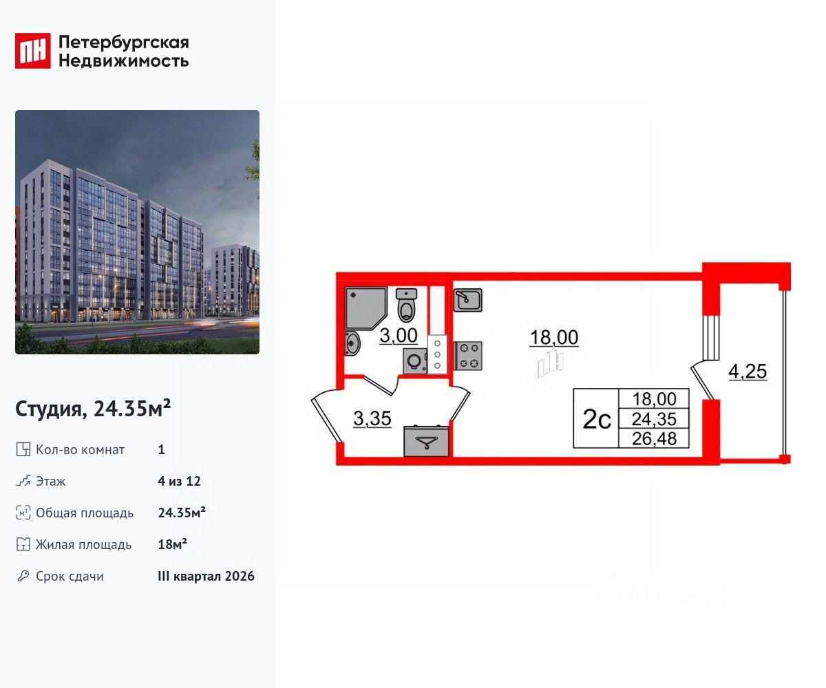 Удобная, классическая, функциональная европланировка, просторная прихожая 3.35 м². Общая площадь студии - 24.35 м², жилая 18 м², высота потолка 2.77 м.