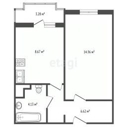 • Планировка: общая 33,5 м², жилая 14,5 м², кухня 9 м².