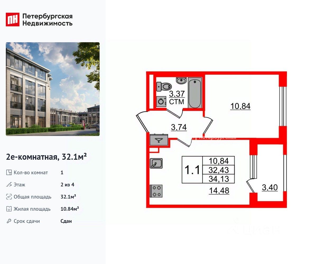 Удобная, классическая, функциональная европланировка, большая кухня-гостиная 14.48 м², вместительная прихожая 3.74 м². Общая площадь квартиры - 32.1 м², жилая 10.84 м², высота потолка 2.75 м.