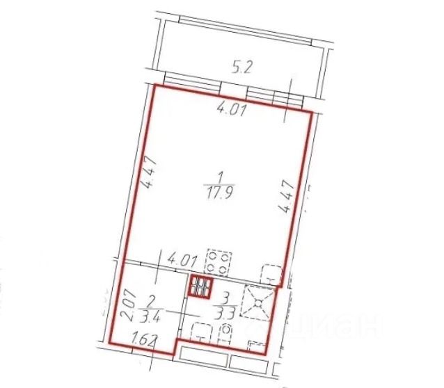 Площадь студии 24,6 кв.м.+ лоджия 5,2 метра дополнительно.