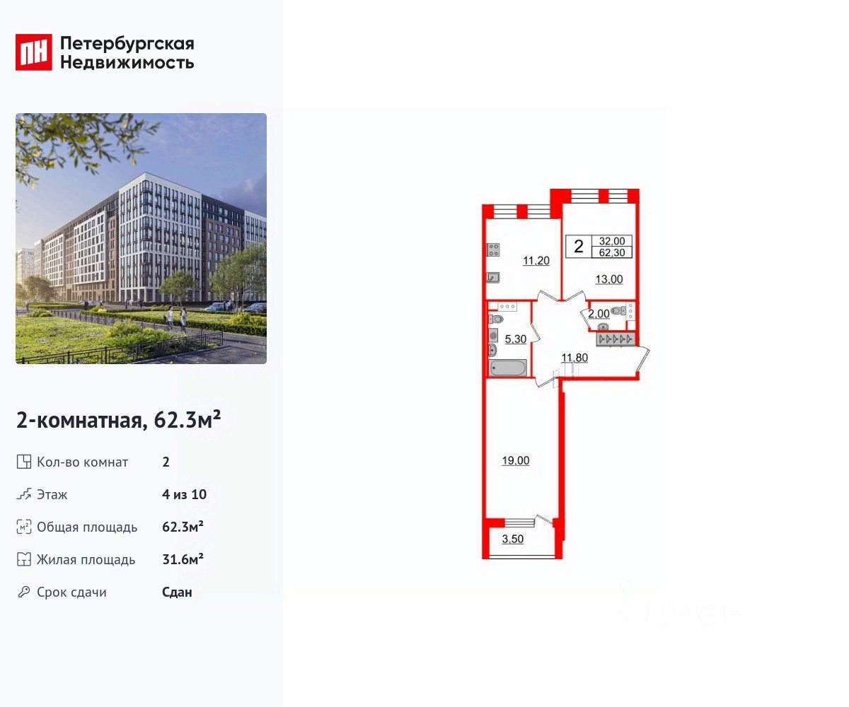 Удобная, классическая планировка, кухня 11.1 м², просторная прихожая 11.6 м². Общая площадь квартиры - 62.3 м², жилая 31.6 м², высота потолка 3 м.