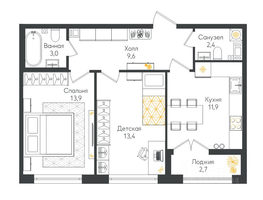 Продаётся 2-комнатная квартира в строящемся доме (Дом 1), срок сдачи: I-кв. 2027, общей площадью 56.7 кв.м., на 6 этаже. Кронунг ЮГ - жилой дом комфорт-класса в тихом уютном районе на берегу реки Дудергофки. Невысокая этажность, современная архитектура, закрытый двор с площадками для игр и отдыха.