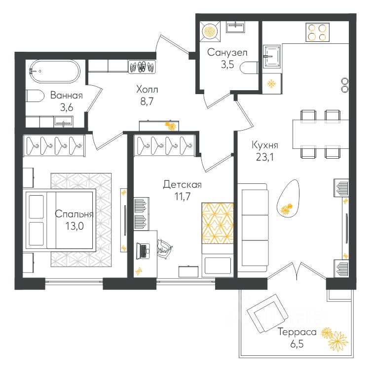 Продаётся 3-комнатная квартира в строящемся доме (Дом 1), срок сдачи: I-кв. 2027, общей площадью 65.6 кв.м., на 1 этаже. Кронунг ЮГ - жилой дом комфорт-класса в тихом уютном районе на берегу реки Дудергофки. Невысокая этажность, современная архитектура, закрытый двор с площадками для игр и отдыха.