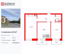 Удобная, классическая планировка. Общая площадь квартиры - 68.5 м², высота потолка 2.58 м.