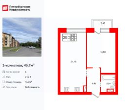 Удобная, классическая планировка. Общая площадь квартиры - 43.7 м², высота потолка 2.58 м.