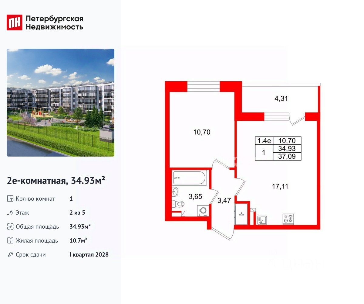 Удобная, классическая, функциональная европланировка, большая кухня-гостиная 17.11 м², вместительная прихожая 3.47 м². Общая площадь квартиры - 34.93 м², жилая 10.7 м², высота потолка 2.77 м.