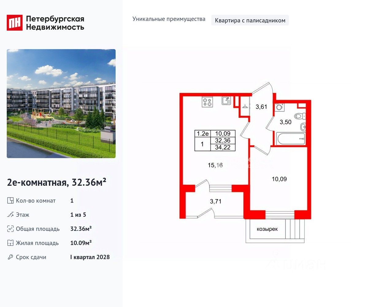 Уникальная, функциональная европланировка, большая кухня-гостиная 15.16 м², вместительная прихожая 3.61 м². Общая площадь квартиры - 32.36 м², жилая 10.09 м², высота потолка 2.77 м.