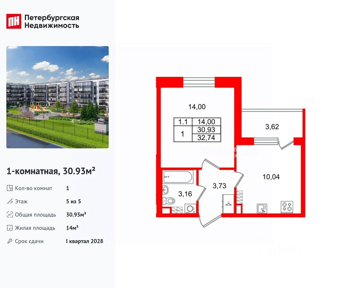 Удобная, классическая планировка, кухня 10.04 м², вместительная прихожая 3.73 м². Общая площадь квартиры - 30.93 м², жилая 14 м², высота потолка 3.07 м.