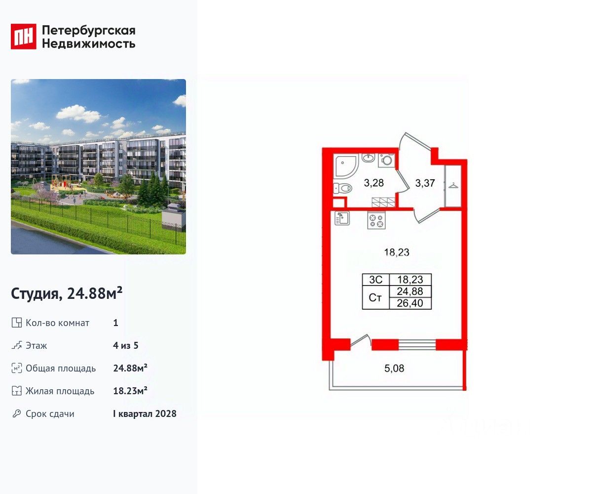Удобная, классическая, функциональная европланировка, просторная прихожая 3.37 м². Общая площадь студии - 24.88 м², жилая 18.23 м², высота потолка 2.77 м.
