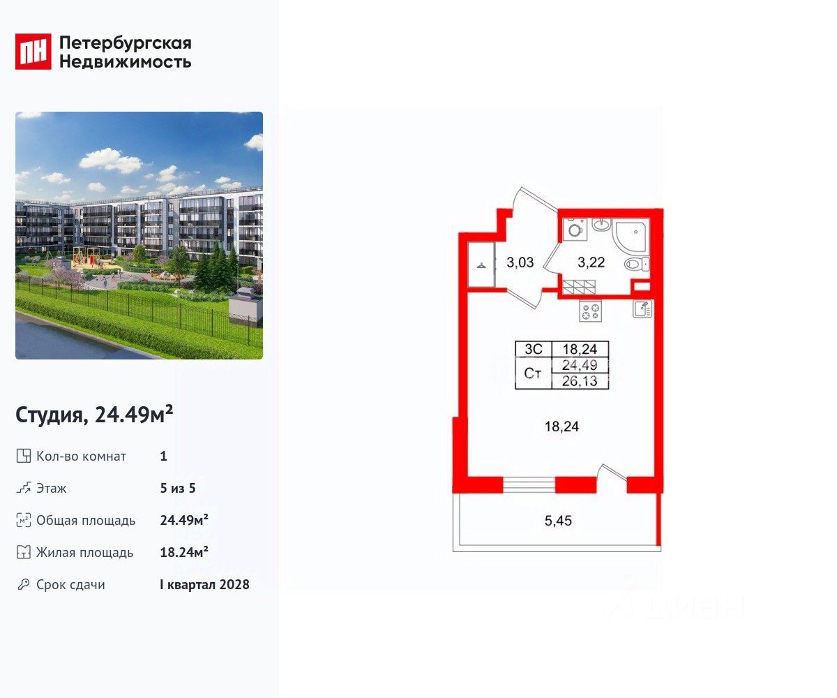 Удобная, классическая, функциональная европланировка, вместительная прихожая 3.03 м². Общая площадь студии - 24.49 м², жилая 18.24 м², высота потолка 3.07 м.