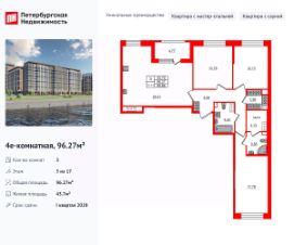 Уникальная, функциональная европланировка, большая кухня-гостиная 28.91 м², вместительная прихожая 9.5 м². Общая площадь квартиры - 96.27 м², жилая 43.7 м², высота потолка 2.77 м.