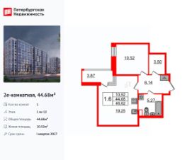 Удобная, классическая, функциональная европланировка, большая кухня-гостиная 19.25 м², просторная прихожая 6.14 м². Общая площадь квартиры - 44.68 м², жилая 10.52 м², высота потолка 2.77 м.