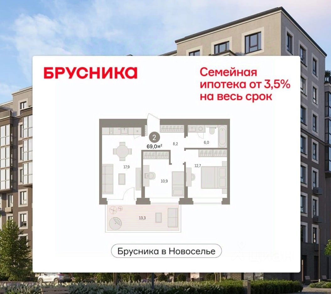 Продается 2-комн. квартира от застройщика с предчистовой отделкой в ЖК "Брусника в Новоселье" на 1 этаже. Общая площадь: 68.96 кв.м. Высота потолков 2.7 м.