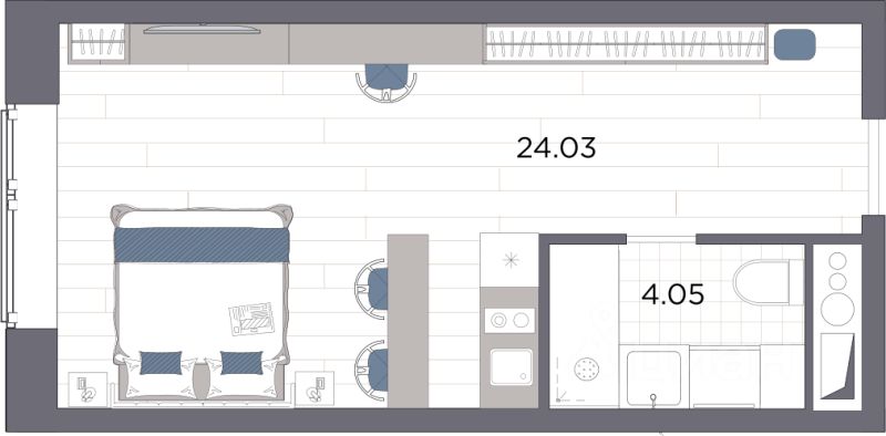 В проекте 960 апартаментов повышенной комфортности площадью от 24,2 до 60, 8 кв.м. Средняя площадь апартамента 28,2 кв.м. Все апартаменты сдаются с отделкой "под ключ" в единой стилистике.