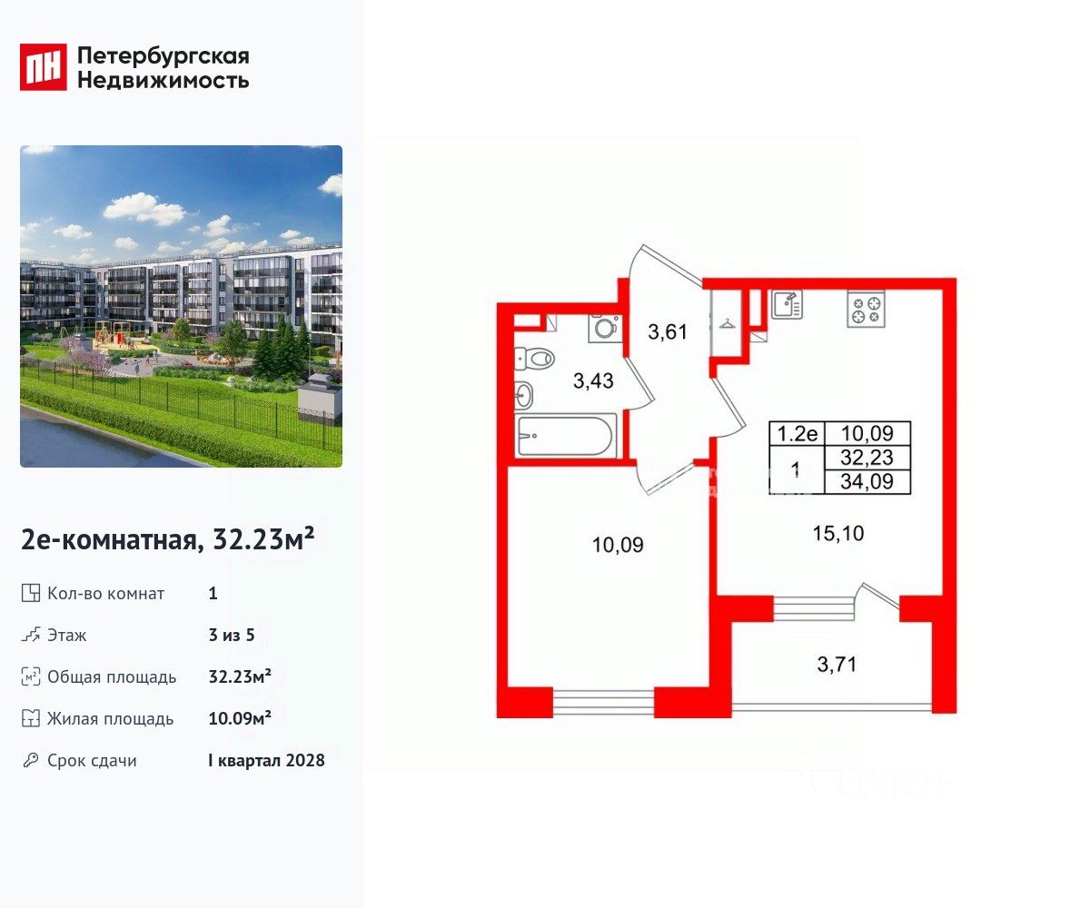 Удобная, классическая, функциональная европланировка, большая кухня-гостиная 15.1 м², вместительная прихожая 3.61 м². Общая площадь квартиры - 32.23 м², жилая 10.09 м², высота потолка 2.77 м.