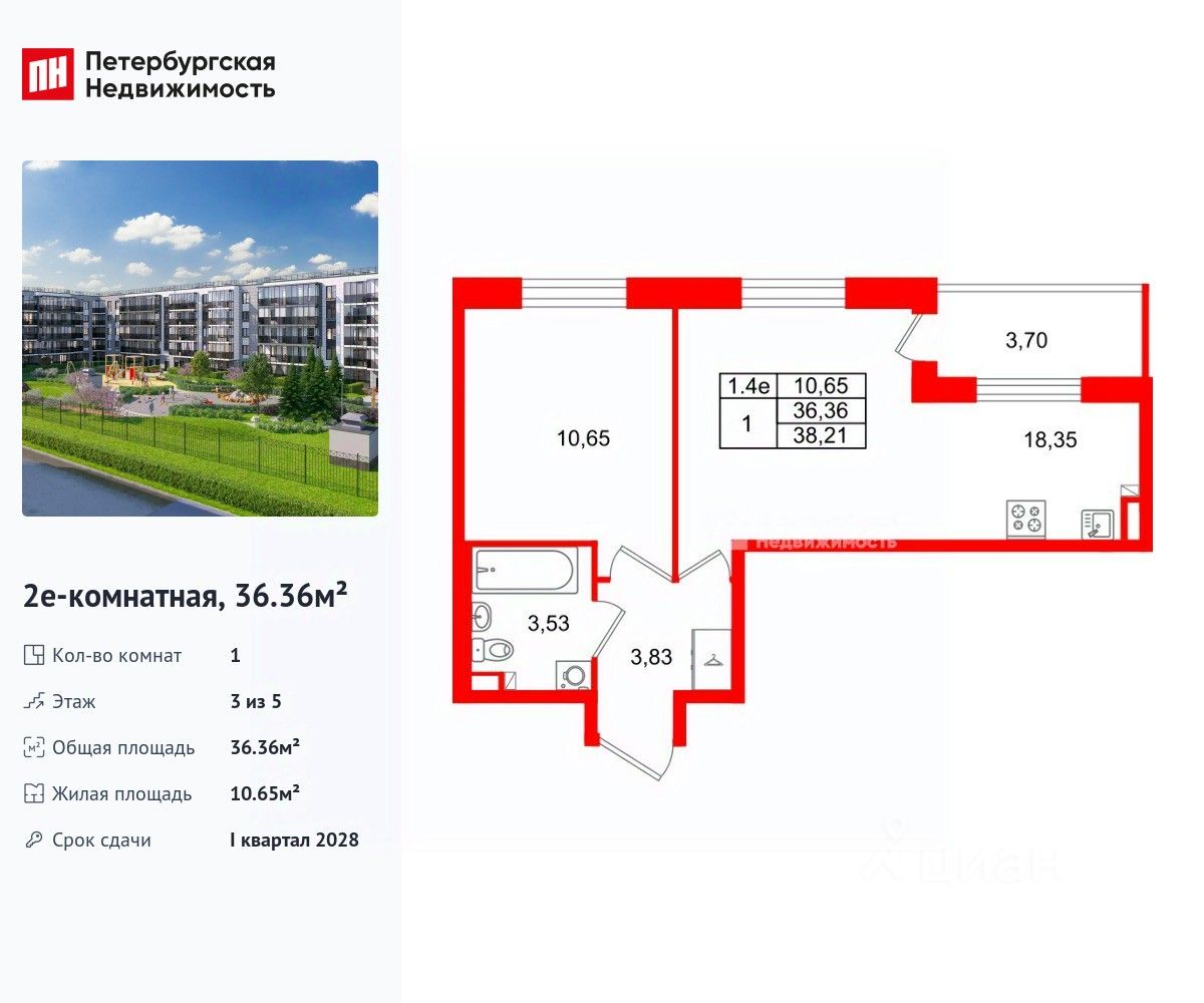 Удобная, классическая, функциональная европланировка, большая кухня-гостиная 18.35 м², вместительная прихожая 3.83 м². Общая площадь квартиры - 36.36 м², жилая 10.65 м², высота потолка 2.77 м.