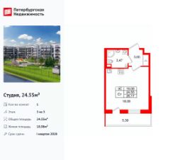 Удобная, классическая, функциональная европланировка, вместительная прихожая 3 м². Общая площадь студии - 24.55 м², жилая 18.08 м², высота потолка 2.77 м.