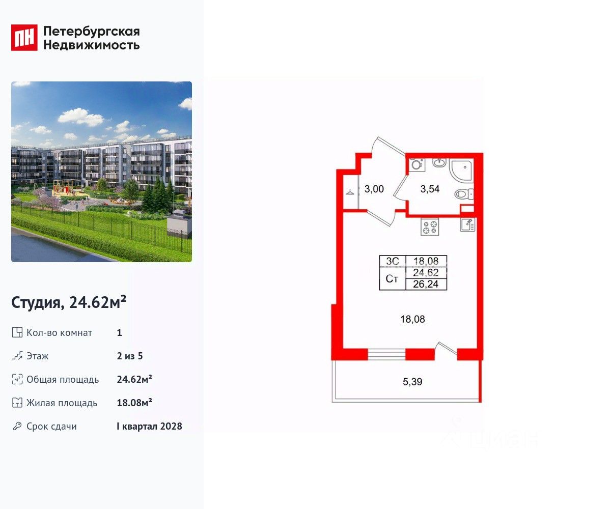 Удобная, классическая, функциональная европланировка, вместительная прихожая 3 м². Общая площадь студии - 24.62 м², жилая 18.08 м², высота потолка 2.77 м.