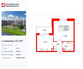 Удобная, классическая планировка, кухня 10.75 м², вместительная прихожая 3.48 м². Общая площадь квартиры - 35.37 м², жилая 17.06 м², высота потолка 2.77 м.