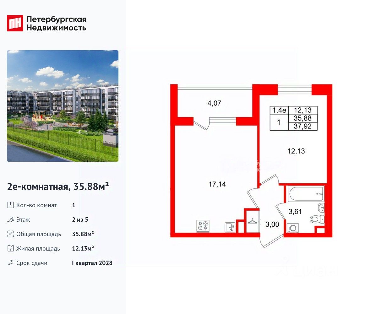 Удобная, классическая, функциональная европланировка, большая кухня-гостиная 17.14 м², вместительная прихожая 3 м². Общая площадь квартиры - 35.88 м², жилая 12.13 м², высота потолка 2.77 м.