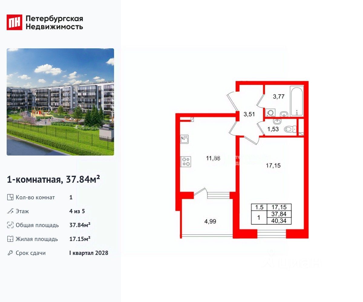 Удобная, классическая планировка, кухня 11.88 м², вместительная прихожая 3.51 м². Общая площадь квартиры - 37.84 м², жилая 17.15 м², высота потолка 2.77 м.