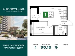 В живописном районе на юге Санкт-Петербурга, рядом с берегом Невы и Невским лесопарком, продается 1-комнатная квартира площадью 35.15 кв. м, расположенная на 9 этаже 12-этажного дома 6. Квартира находится в жилом комплексе комфорт-класса "Имена" от ГК "ССК".