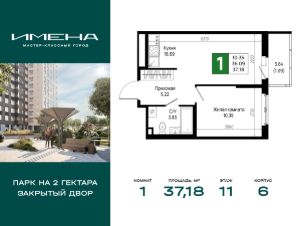 В живописном районе на юге Санкт-Петербурга, рядом с берегом Невы и Невским лесопарком, продается 1-комнатная квартира площадью 37.18 кв. м, расположенная на 11 этаже 12-этажного дома 6. Квартира находится в жилом комплексе комфорт-класса "Имена" от ГК "ССК".