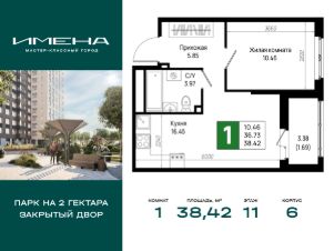 В живописном районе на юге Санкт-Петербурга, рядом с берегом Невы и Невским лесопарком, продается 1-комнатная квартира площадью 38.42 кв. м, расположенная на 11 этаже 22-этажного дома 6. Квартира находится в жилом комплексе комфорт-класса "Имена" от ГК "ССК".