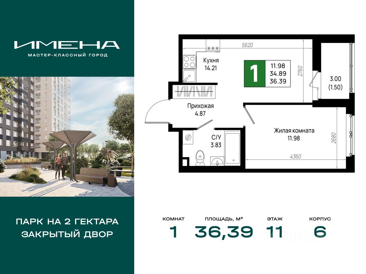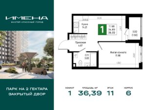 В живописном районе на юге Санкт-Петербурга, рядом с берегом Невы и Невским лесопарком, продается 1-комнатная квартира площадью 36.39 кв. м, расположенная на 11 этаже 12-этажного дома 6. Квартира находится в жилом комплексе комфорт-класса "Имена" от ГК "ССК".