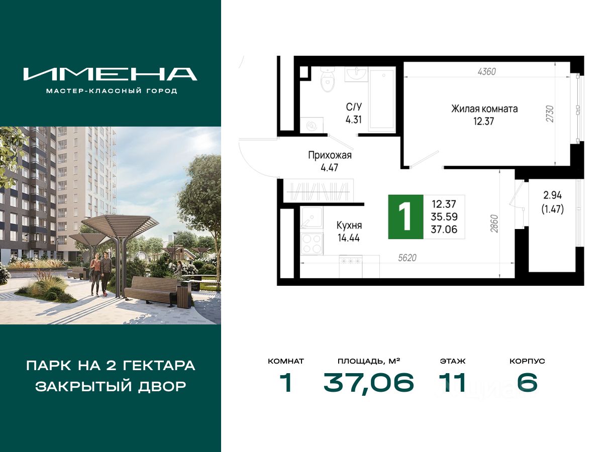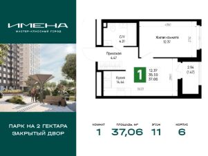 В живописном районе на юге Санкт-Петербурга, рядом с берегом Невы и Невским лесопарком, продается 1-комнатная квартира площадью 37.06 кв. м, расположенная на 11 этаже 12-этажного дома 6. Квартира находится в жилом комплексе комфорт-класса "Имена" от ГК "ССК".